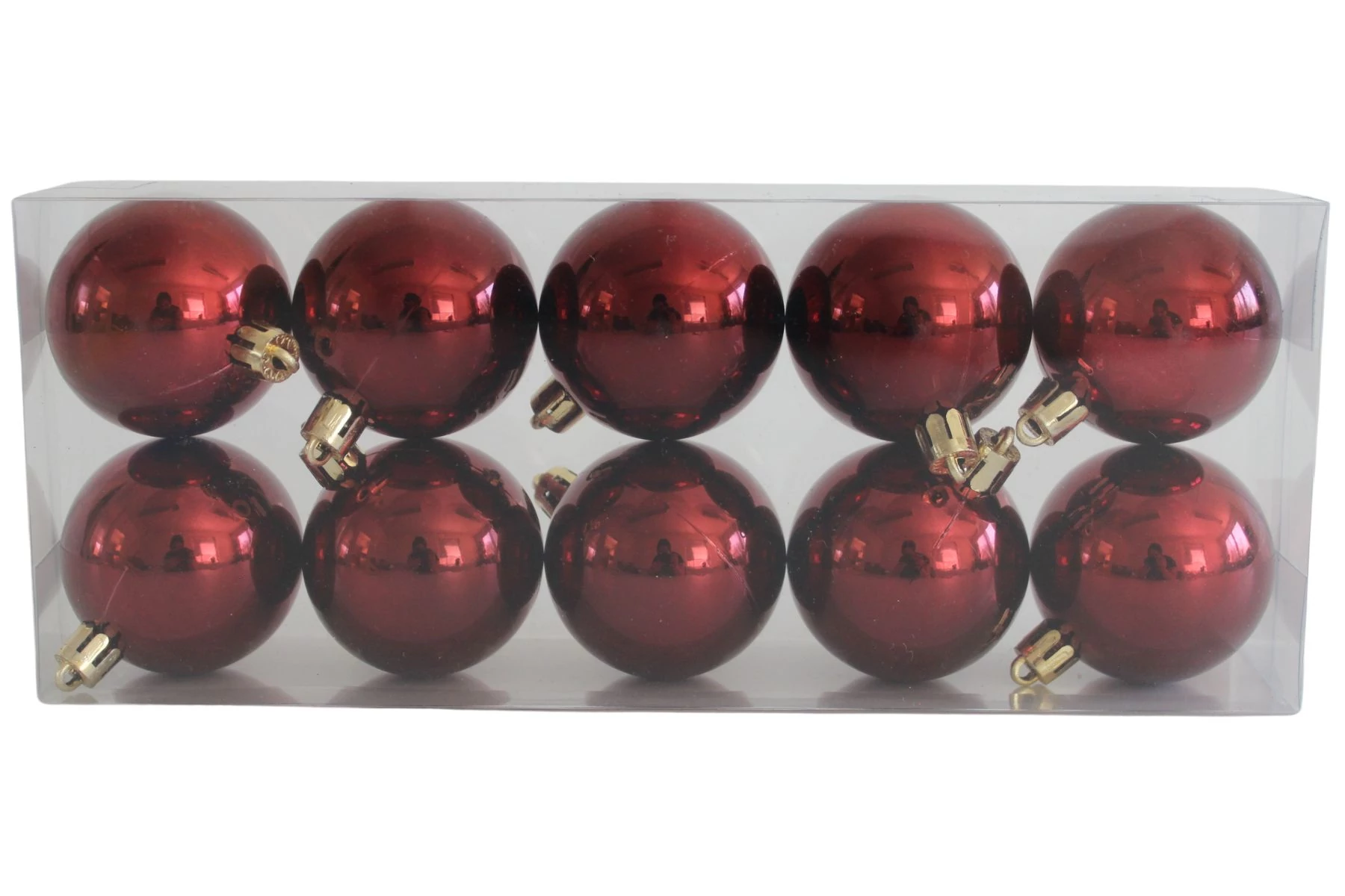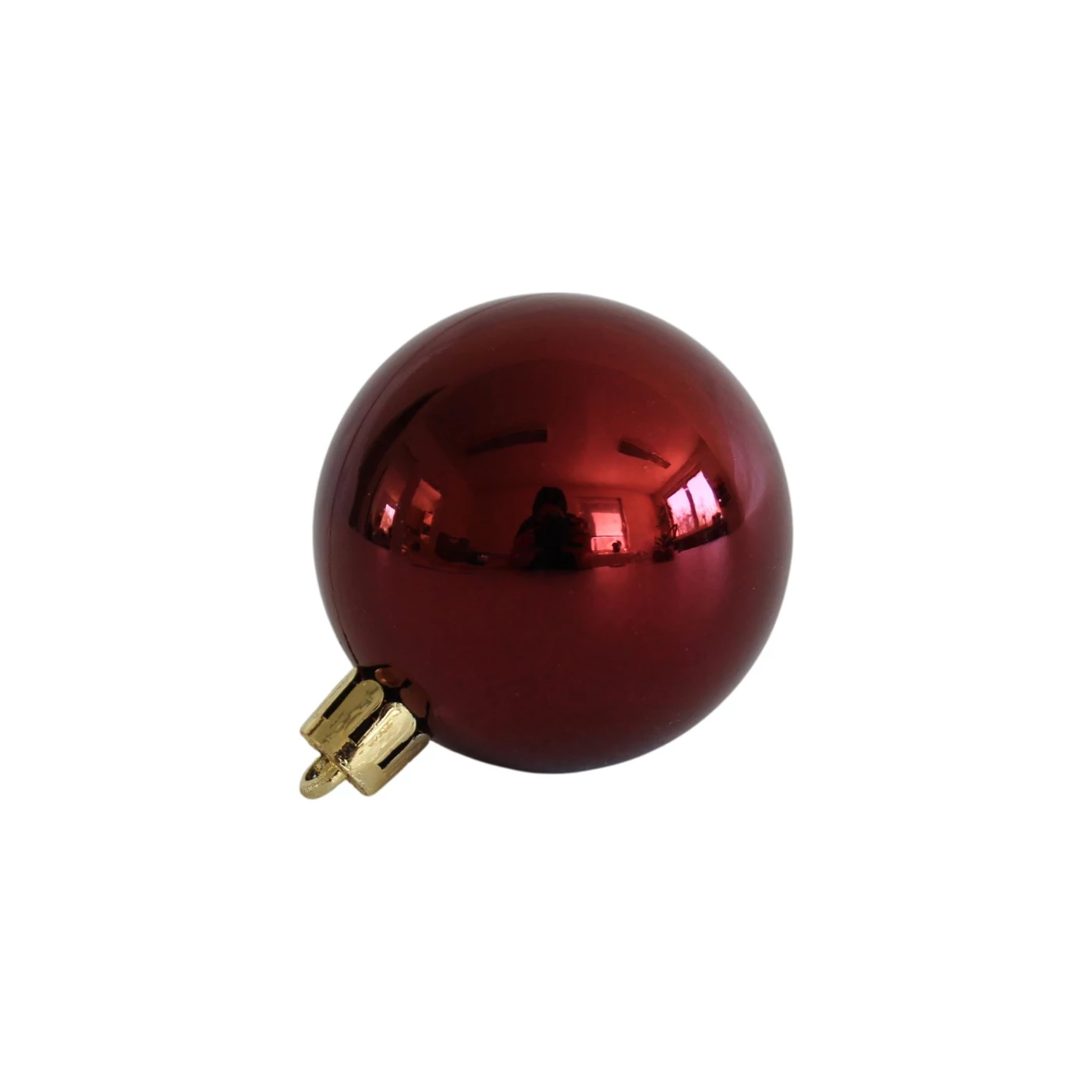 A hagyományos piros színű műanyag gömbök alkalmasak a karácsonyfára akasztásra vagy karácsonyi díszek és koszorúk díszítésére.