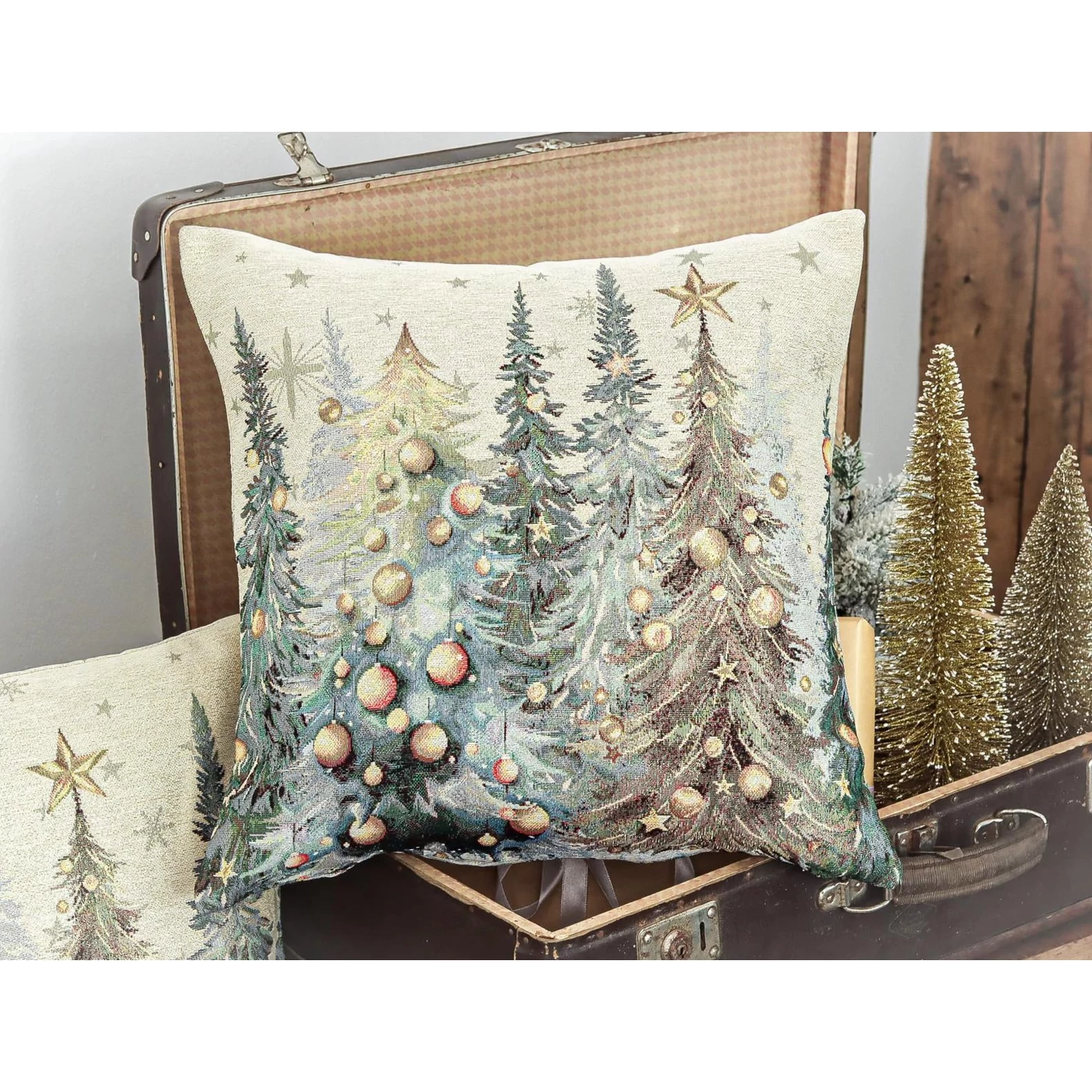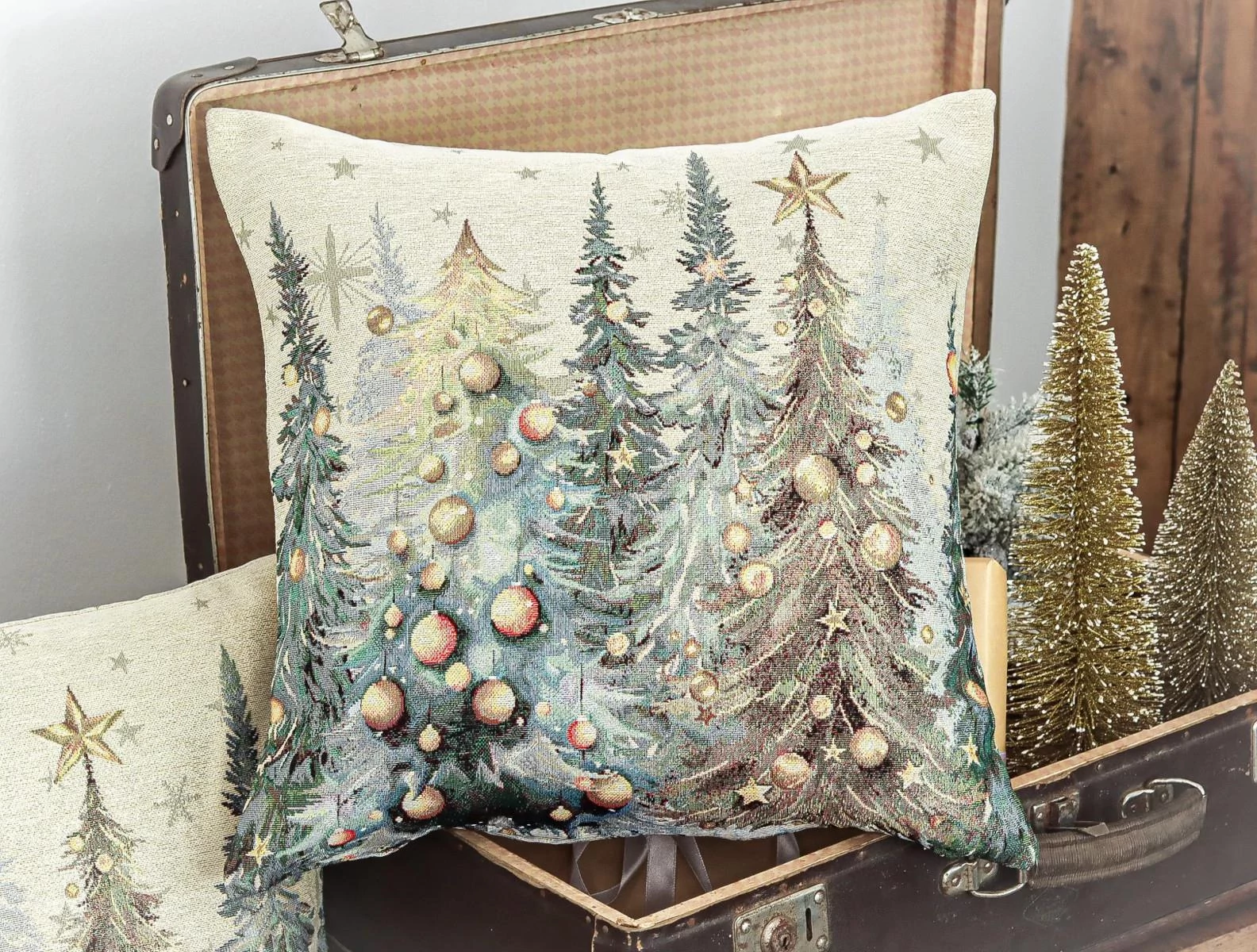 Fenyőerdővel, gömbökkel és csillagokkal dekorált díszpárna huzat kétoldalas mintával. A huzatot az arany lurex szálak finom csillogása teszi különlegessé, amely fényhatásra elegánsan megcsillan. A termék a párnabelsőt nem tartalmazza. A huzat prémium minőségű, gépi szövésű gobelinből készült. Cipzáras záródással rendelkezik, így könnyen levehető és tisztítható. Strapabíró anyaga miatt mindennapi használatra is ideális, ugyanakkor ünnepi dekorációként igazán különleges hangulatot kölcsönöz.