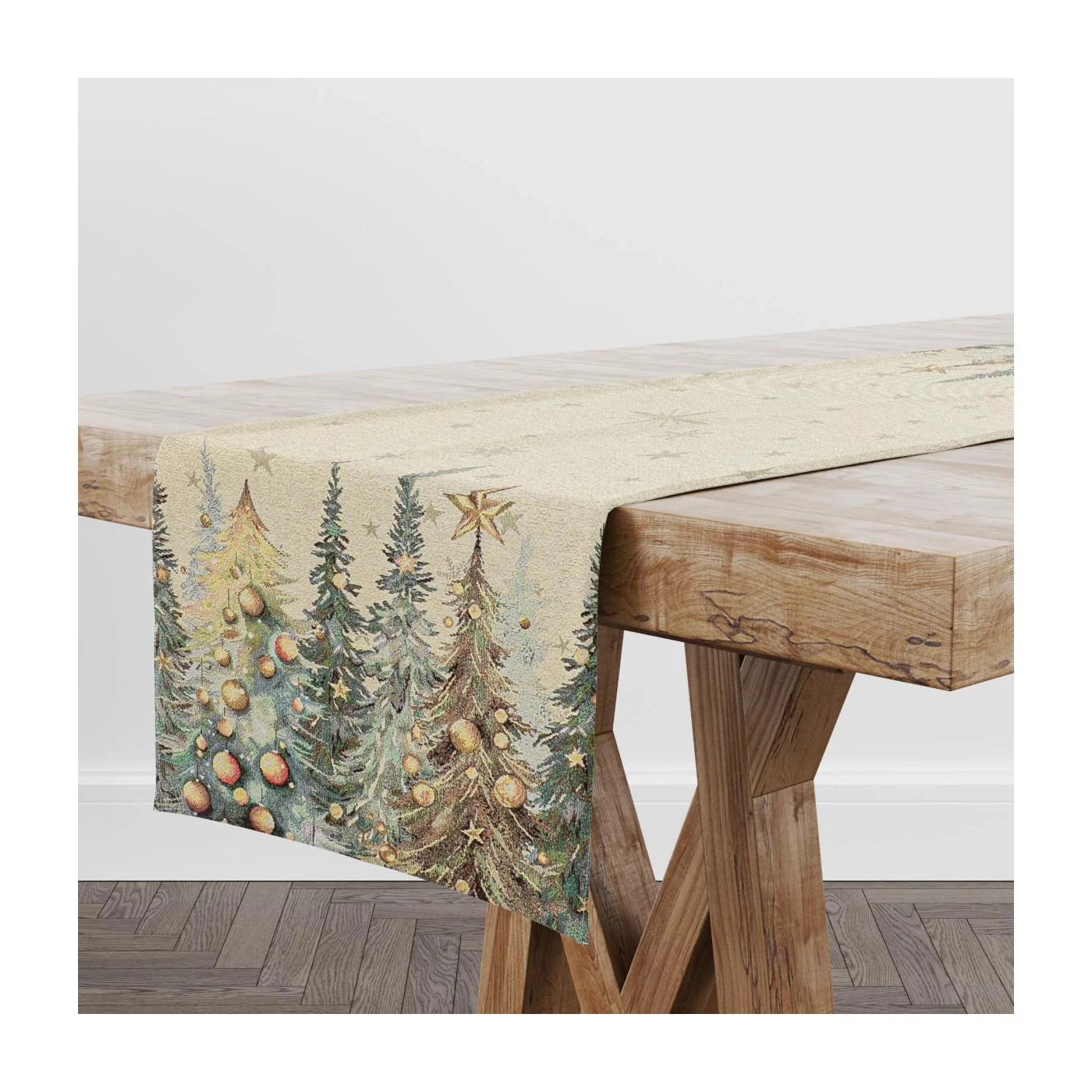Varázsold ünnepivé az asztalterítést ezzel a fenyőerdős asztali futóval, amelyet fényesen csillogó arany lurex szálak tesznek igazán ünnepélyessé. A futón gazdagon díszített karácsonyfák sorakoznak, amelyeket aranyló gömbök, csillagok és hópelyhek egészítenek ki. Használható étkezőasztalon, komódon, dohányzóasztalon vagy ünnepi dekorációként bármely helyiségben.