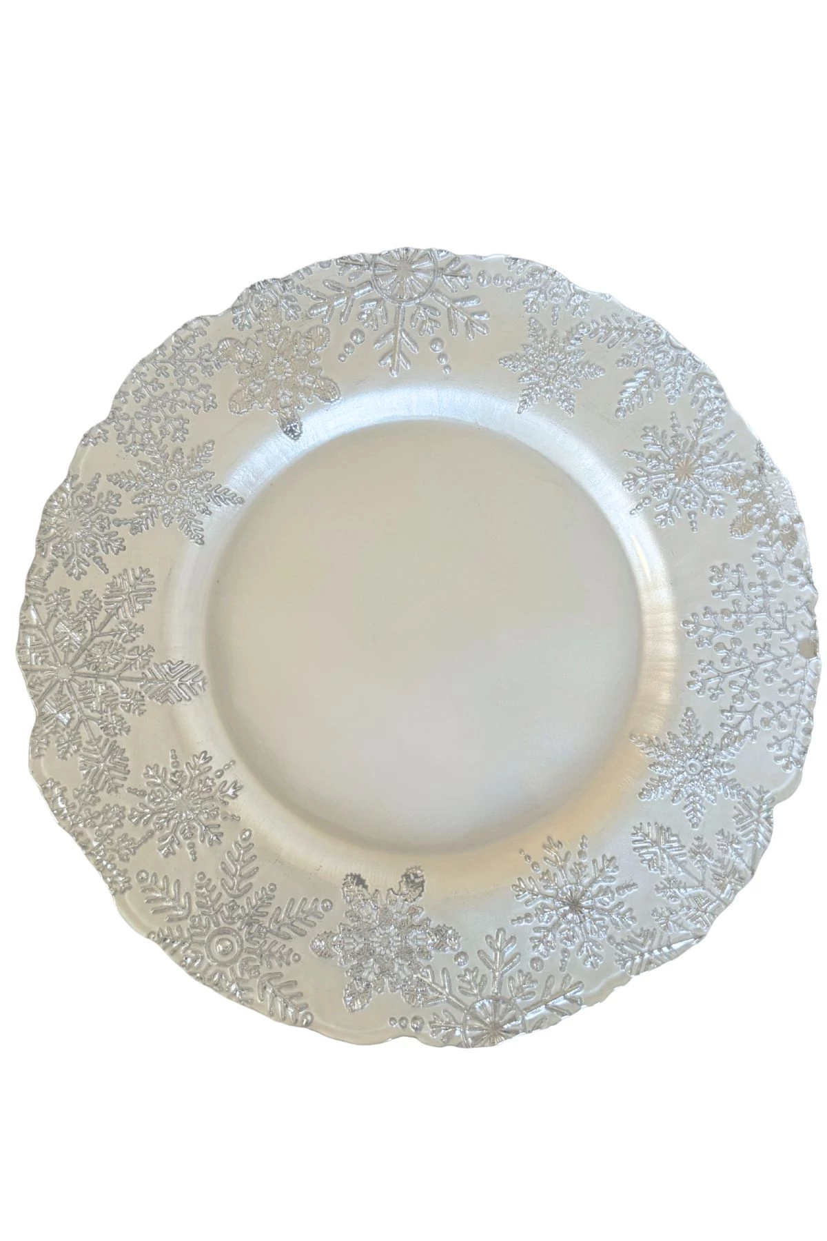 Az elegáns fehér-ezüst kivitelű üvegtányér alkalmas karácsonyi dekorációként az ünnepi asztalra. Díszítések alapjaként is kitűnik.
