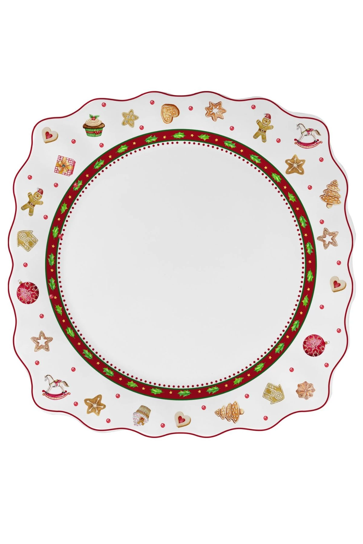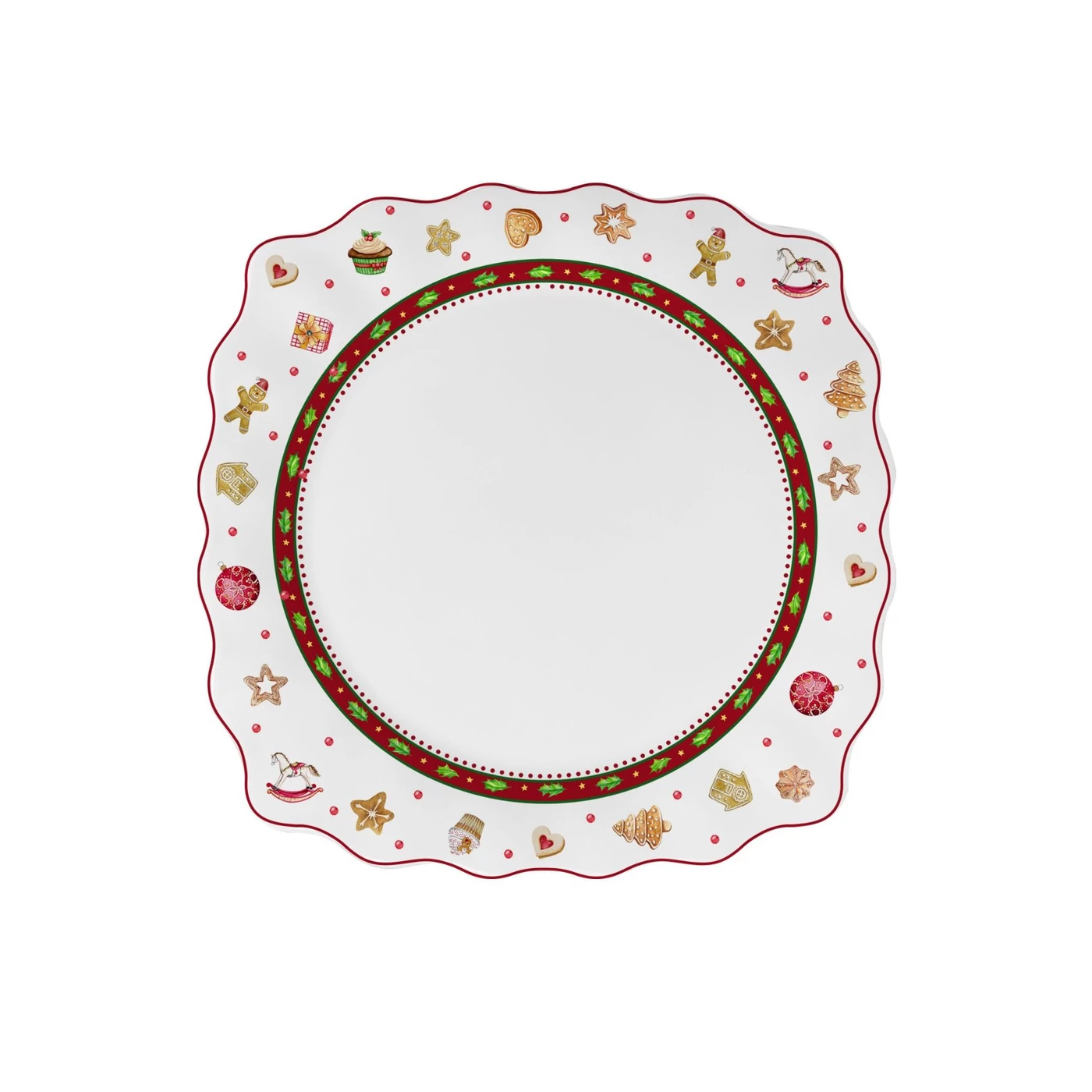 Gyönyörű, részletesen kidolgozott, négyzet alakú, karácsonyi motívummal ellátott sekély tányér. A hagyományos karácsonyi színekben pompázó porcelántányér alkalmas karácsonyi ételek tálalására.
