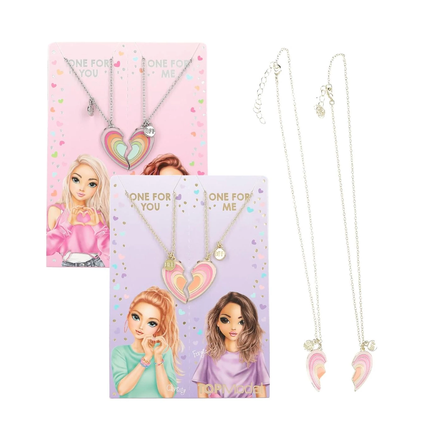 A TOPModel BFF nyakláncai medálként szívfelekkel rendelkeznek, amelyek tökéletesen illeszkednek egymáshoz. 2 minta: ezüst nyakláncok rózsaszín, rózsaszín, narancssárga, zöld és türkiz szívfelekkel, valamint arany nyakláncok rózsaszín, rózsa, sárga és narancssárga szívfelekkel. Mindkét nyaklánc egy további kerek medállal rendelkezik, BFF felirattal. Lánc hossza: 40 cm plusz 5 cm (állítható).