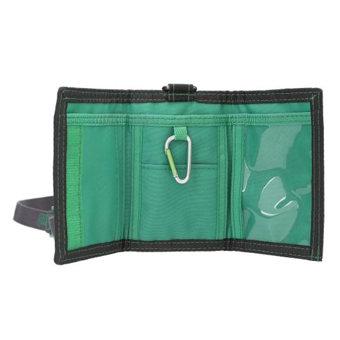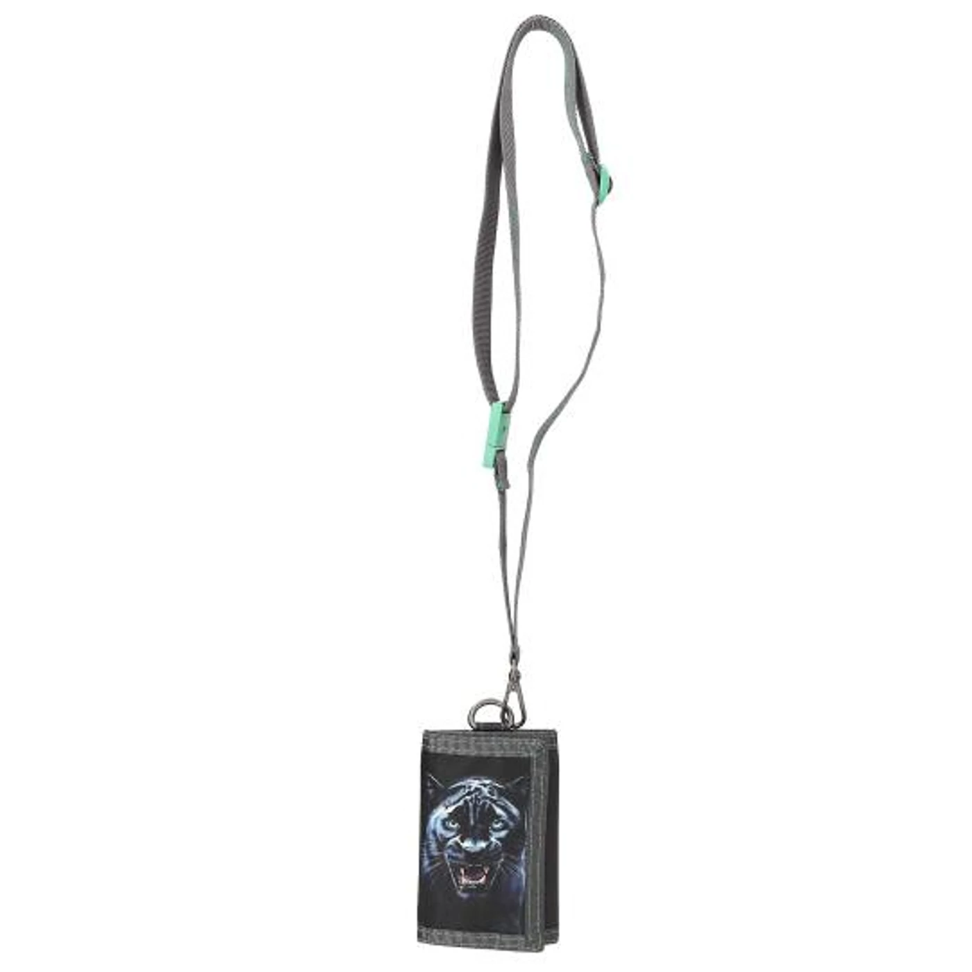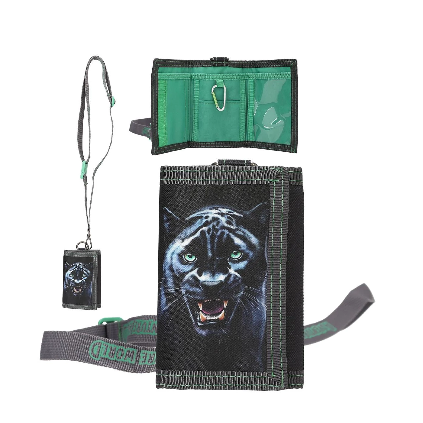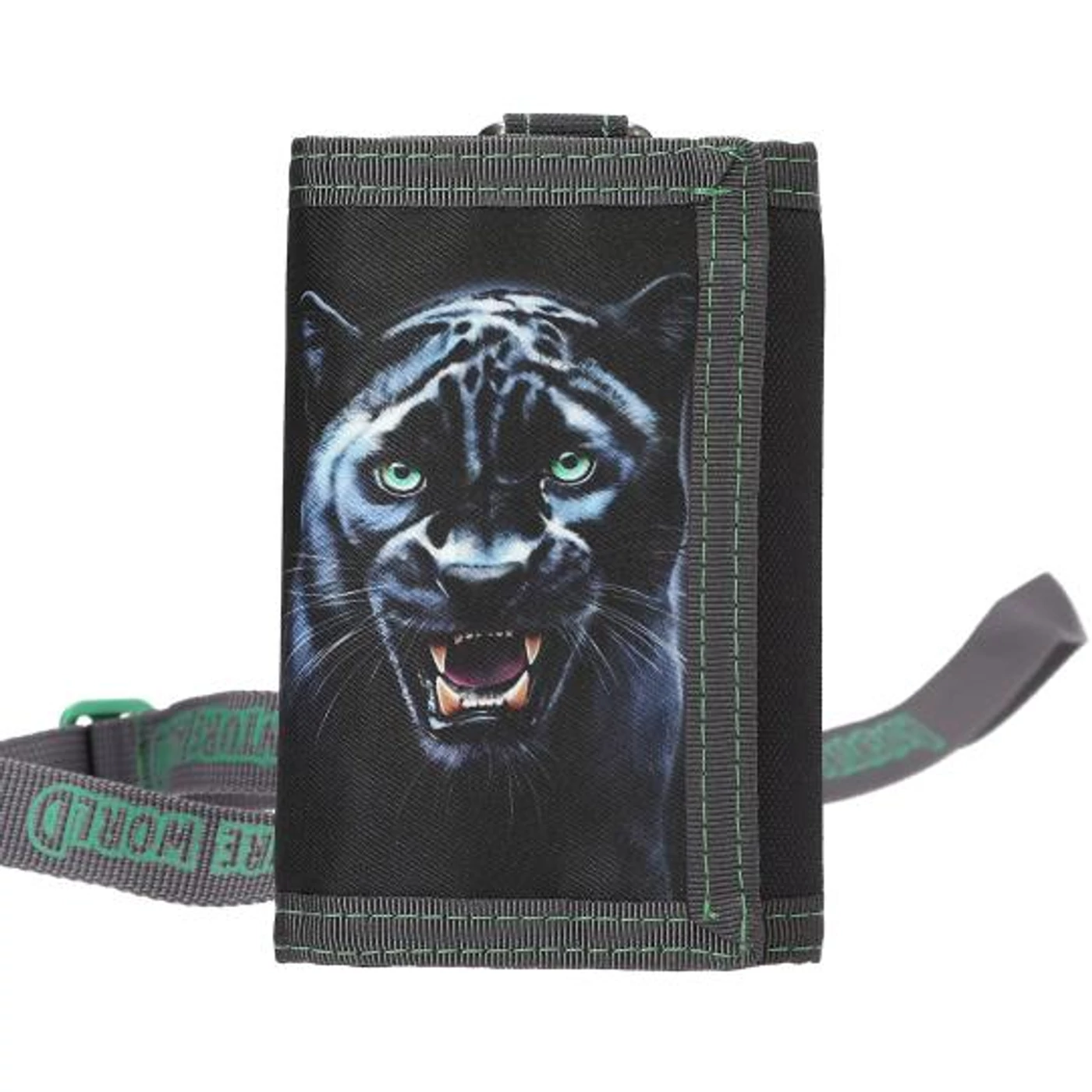 Párduc erő! A fekete párduc feje a fogait mutogatva úgy tűnik, hogy a sötétszürke pénztárca elejéből néz ki. Zöld részletekkel, levehető hosszú zsinórral, nagy karabinerrel a kulcsokhoz, cipzáras rekesz érmék számára, jegyzettartó és különféle rekeszek a kártyák számára, beleértve egy átlátszó betekintőablakkal ellátott rekeszt is. Az Adventure World-től. Anyaga: 100% poliészter