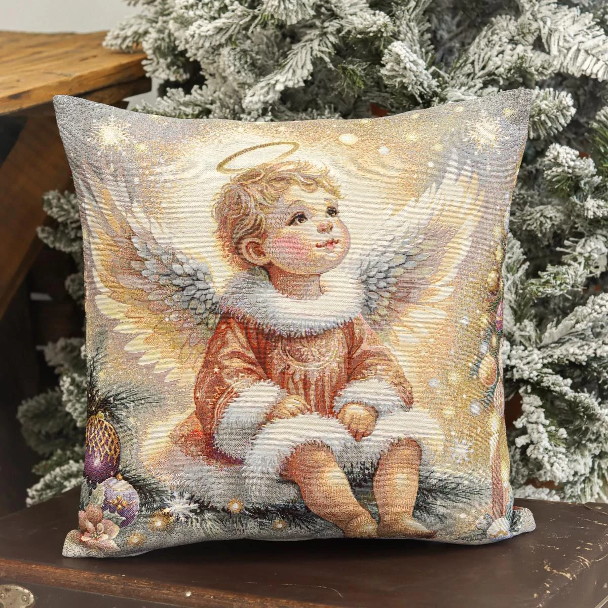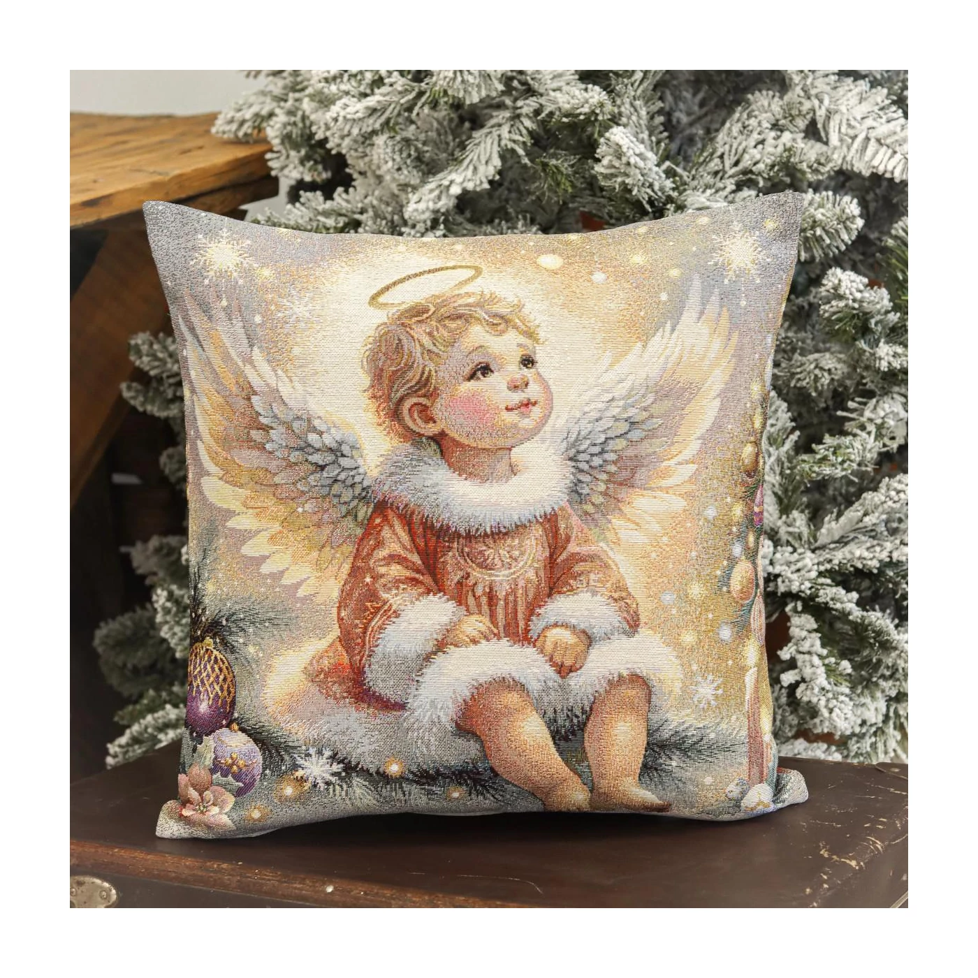 Ünnepi díszpárna huzat kétoldalas mintával, amely egy kedves kis angyalkát ábrázol karácsonyfával, csillagokkal körbevéve. A termék a párnabelsőt nem tartalmazza. A huzat prémium minőségű, gépi szövésű gobelinből készült. Cipzáras záródással rendelkezik, így könnyen levehető és tisztítható. Strapabíró anyaga miatt mindennapi használatra is ideális, ugyanakkor ünnepi dekorációként igazán különleges hangulatot kölcsönöz.