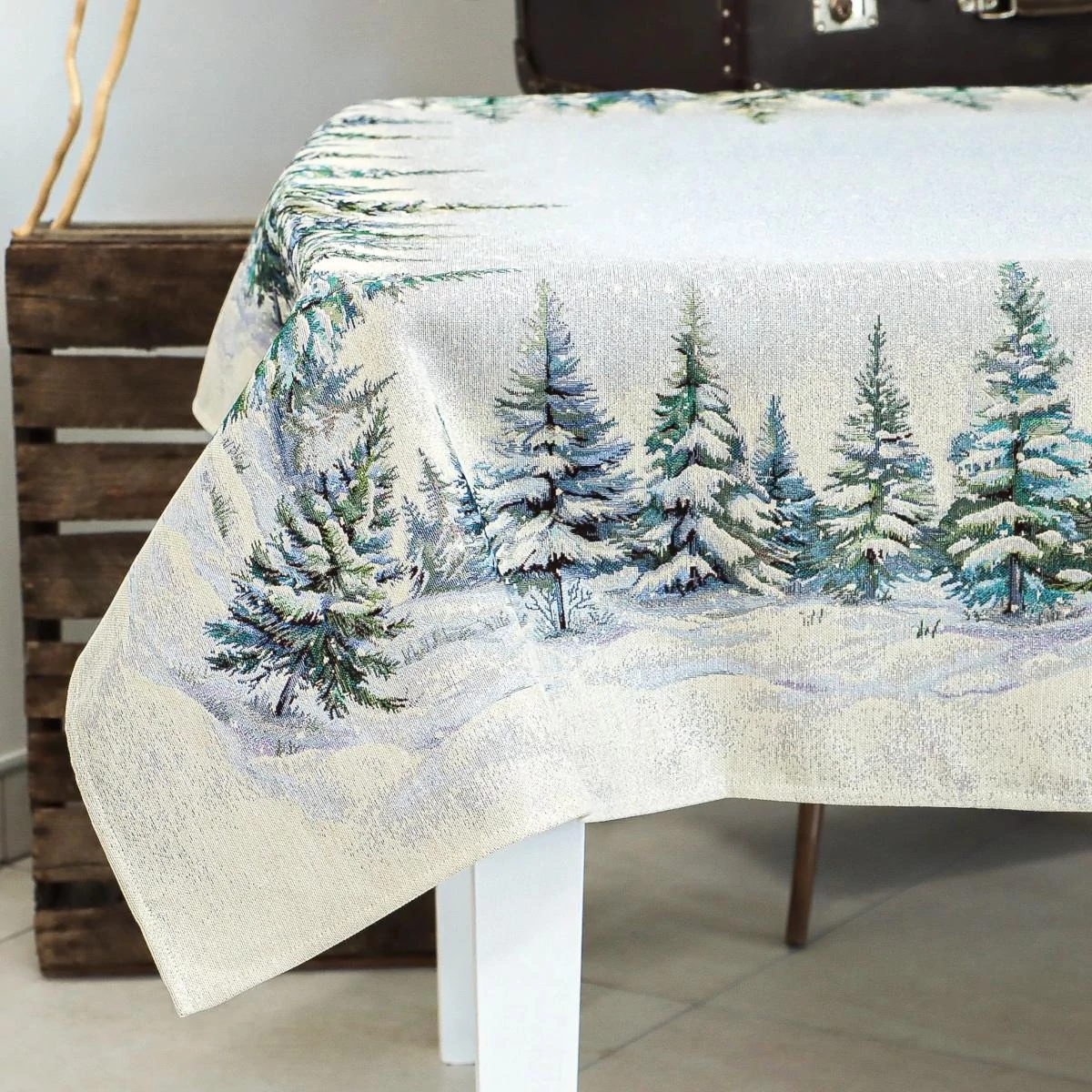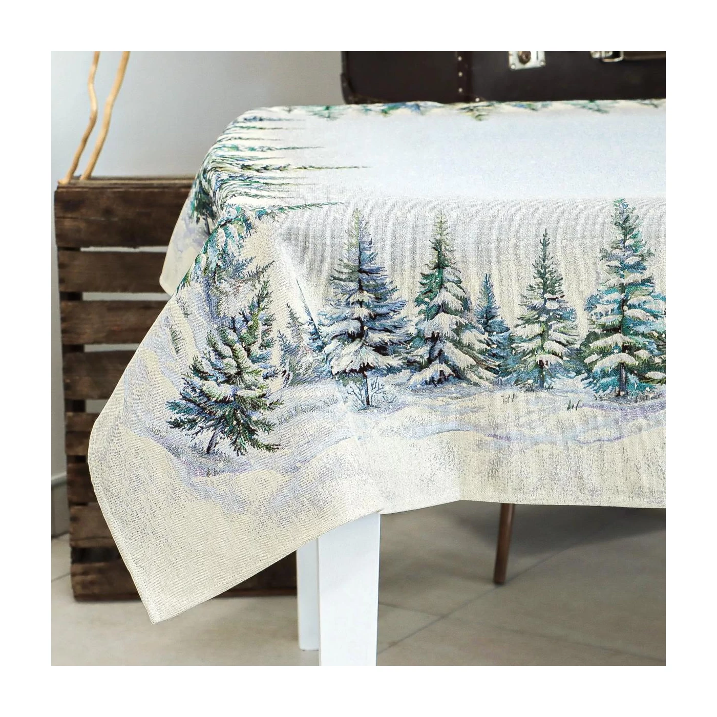 Varázsold ünnepivé az asztalterítést ezzel a különleges terítővel, amelyet fényesen csillogó ezüst lurex szálak tesznek igazán ünnepélyessé. A terítő gyönyörűen megidézi a téli erdők varázsát. A részletgazdag mintán havas fenyőfák és hulló hópelyhek jelennek meg, amelyek meghitt, nyugodt hangulatot teremtenek otthonodban. Mérete ideális 4-6 személyes étkezőasztalokhoz. A prémium minőségű, gépi szövésű spanyol gobelin tartós és elegáns, így mindennapi használatra és ünnepi alkalmakra is tökéletes.