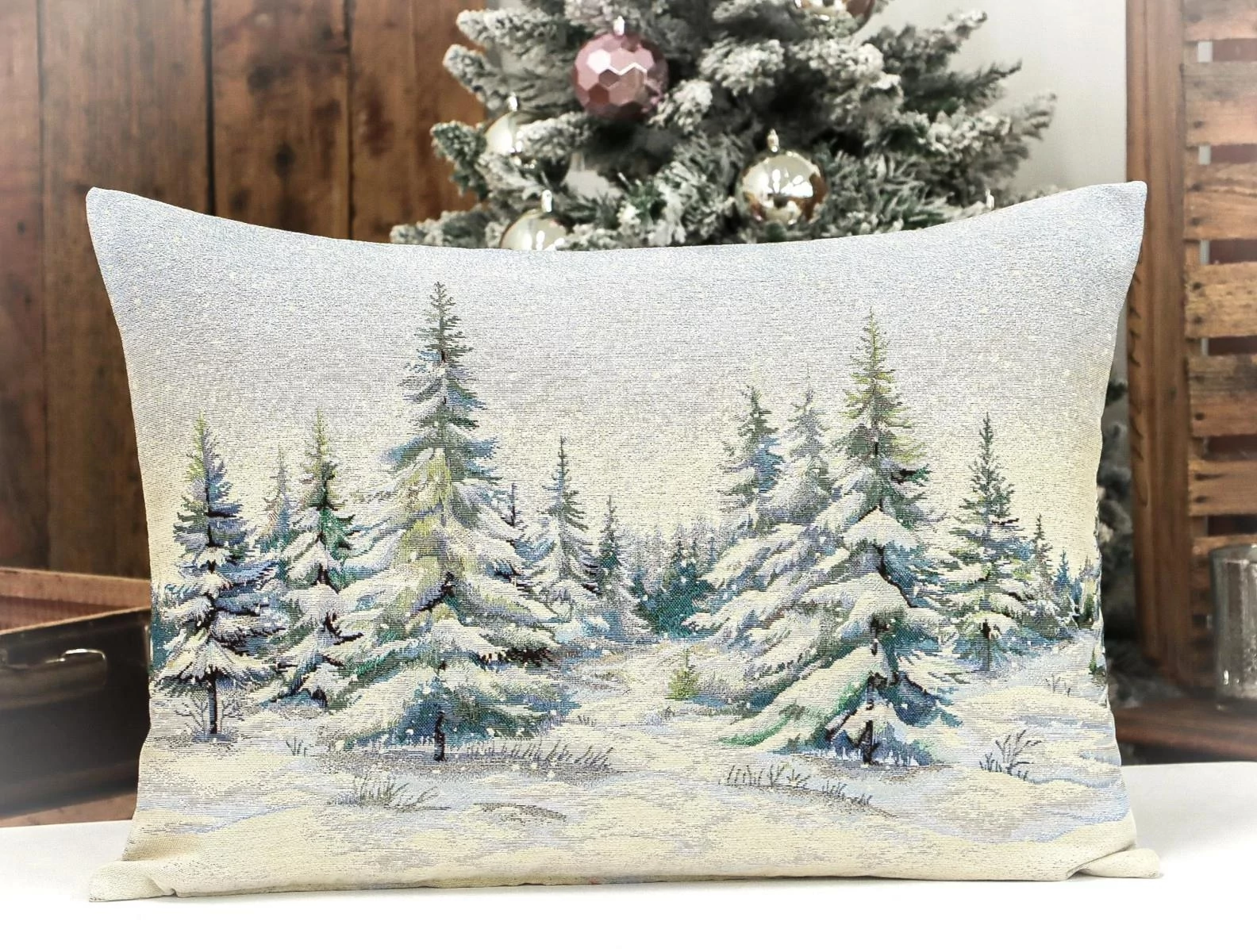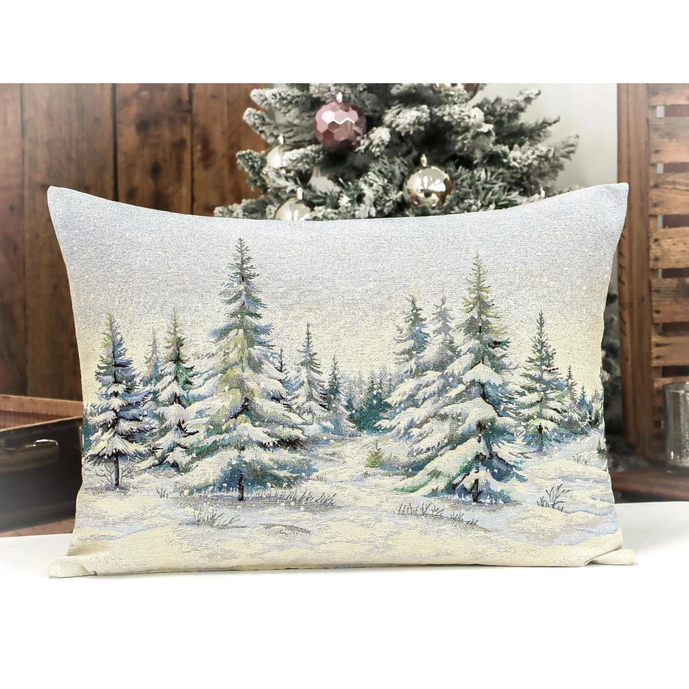 Nagyméretű díszpárna huzat havas fenyőerdővel, kétoldalas mintával. Anyaga gépi szövésű gobelin, cipzár a huzat alján található. Ezüst lurexes szövése teszi igazán különlegessé és ünnepi hangulatúvá. A termék a nagy párnabelsőt tartalmazza.