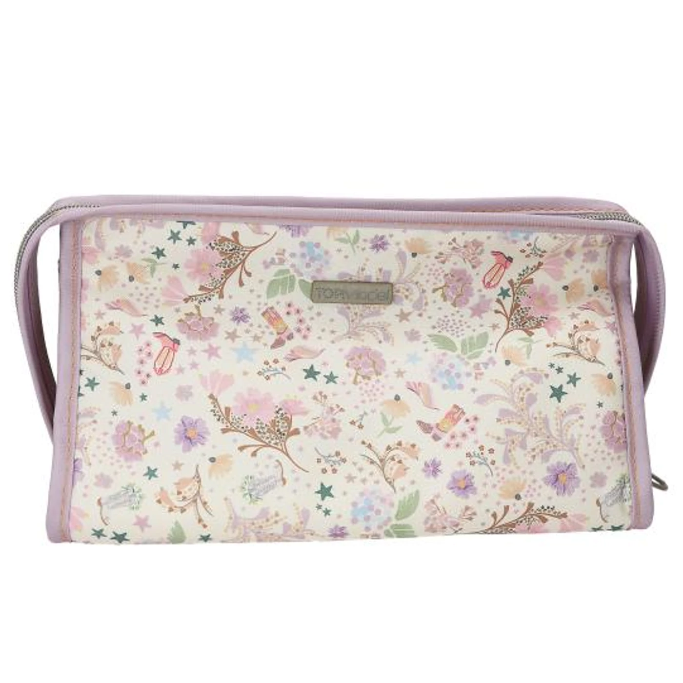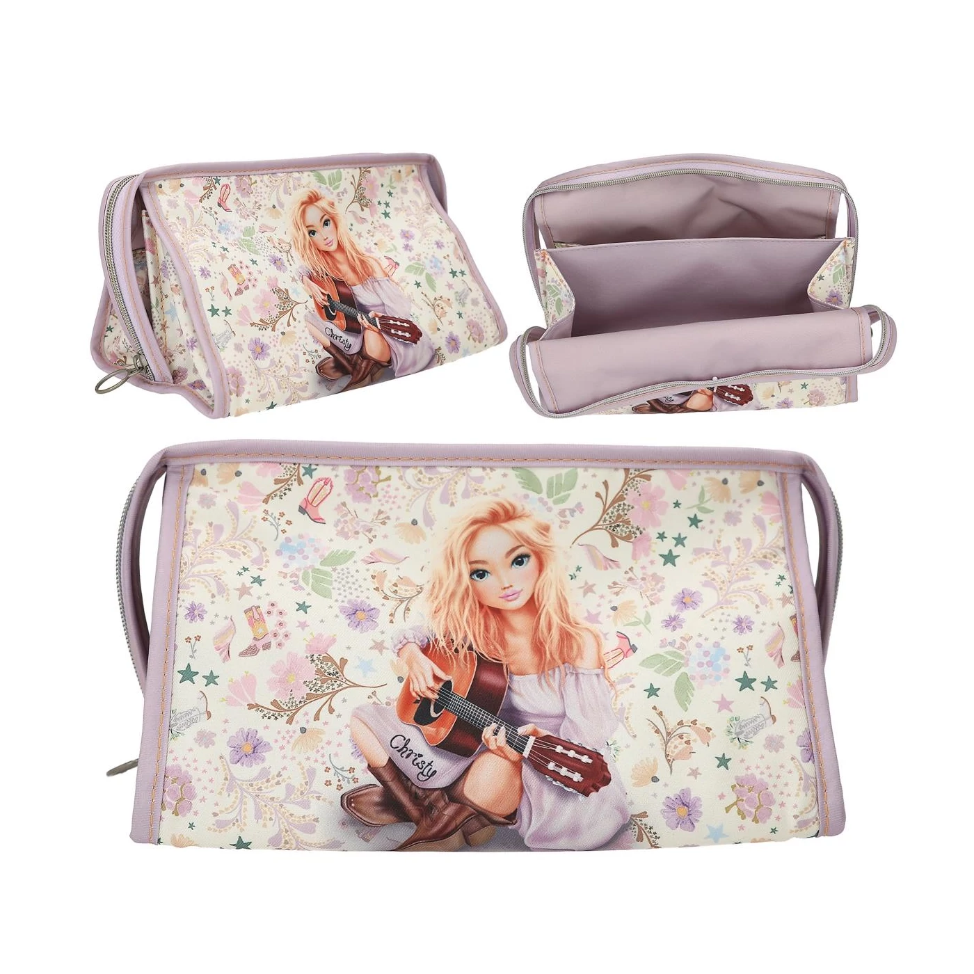 Halványlila részletekkel díszített, multifunkcionális, krémszínű TOPModel táska romantikus modell motívummal rendelkezik, elején egy gitárral, körben pedig gyönyörű, finom mintával, apró virágokkal, levelekkel, csillagokkal és cowboycsizmákkal. A tetején található hosszú cipzár lehetővé teszi a táska szélesre nyitását, és jó rálátást biztosít a két tágas belső rekeszre. Tökéletes kozmetikumok vagy tollak és egyebek számára. Fő anyaga: 100% poliészter.