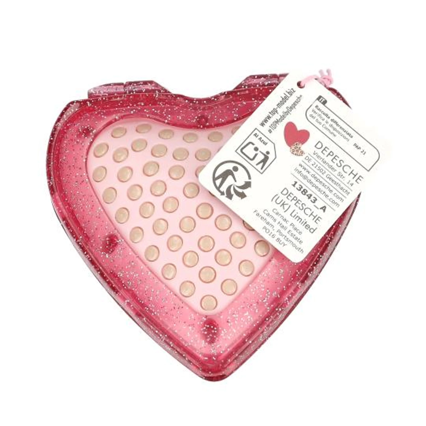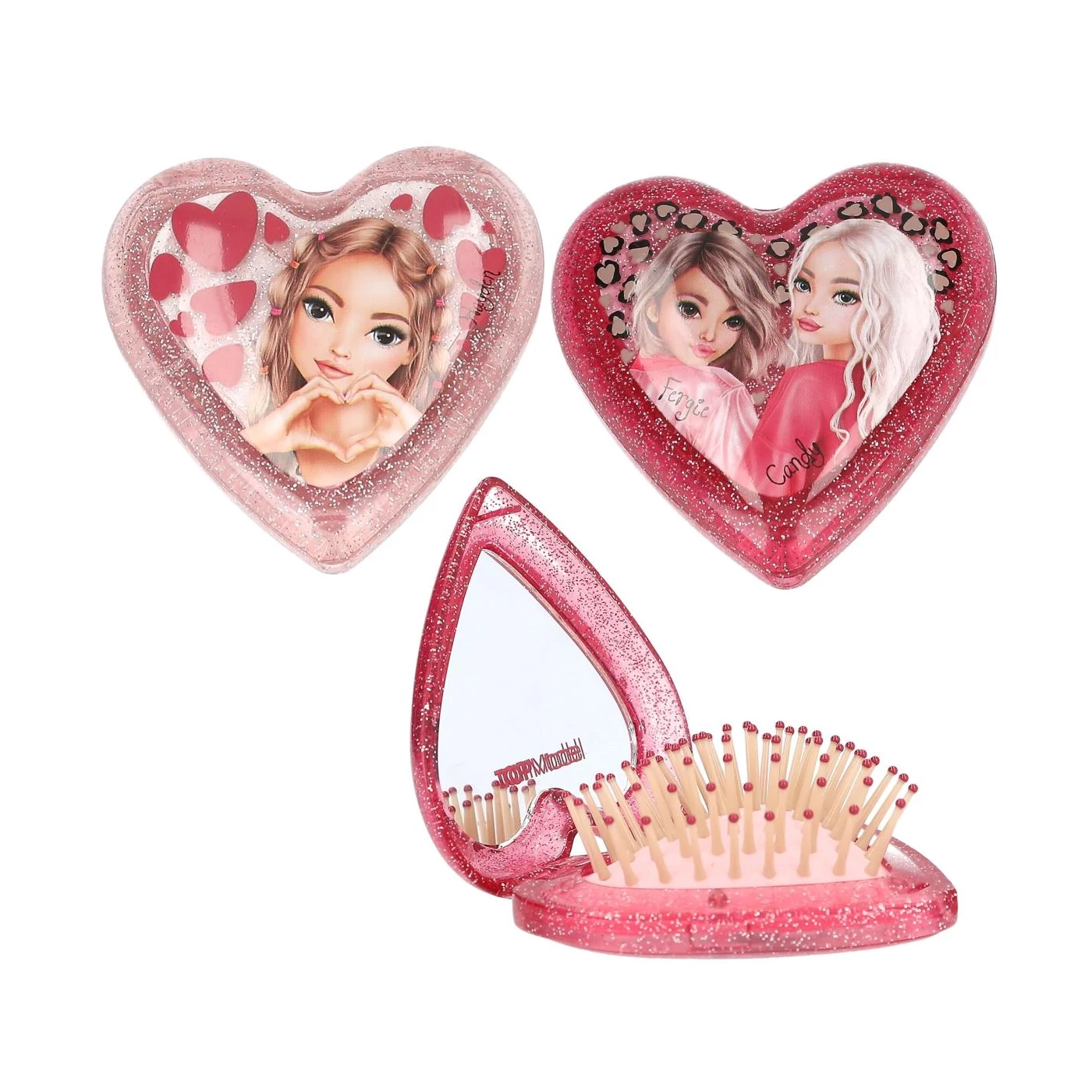 Hajtsa össze és fésülje: A TOPModel szív alakú összecsukható hajkefék mindig nálad vannak! Belül felálló sörtéjű párnával és tükörrel, kívül átlátszó, csillogó rozé vagy rózsaszín színben, stílusos modellmotívummal.
