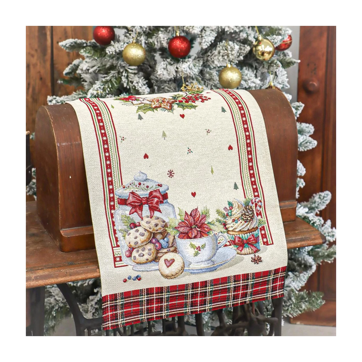 Varázsold ünnepivé az asztalterítést ezzel a különleges spanyol gobelin asztali futóval, amelyet fényesen csillogó ezüst lurex szálak tesznek igazán ünnepélyessé. A futó mintáján édes aprósütemények, muffinok, és egyéb ünnepi dekorok találhatók, a két végét pedig hagyományos skót minta díszíti. Az ezüst lurex szálak finoman megcsillannak a fényben, így különösen hangulatossá teszik a karácsonyi asztalt. Használható étkezőasztalon, komódon, dohányzóasztalon vagy ünnepi dekorációként bármely helyiségben.